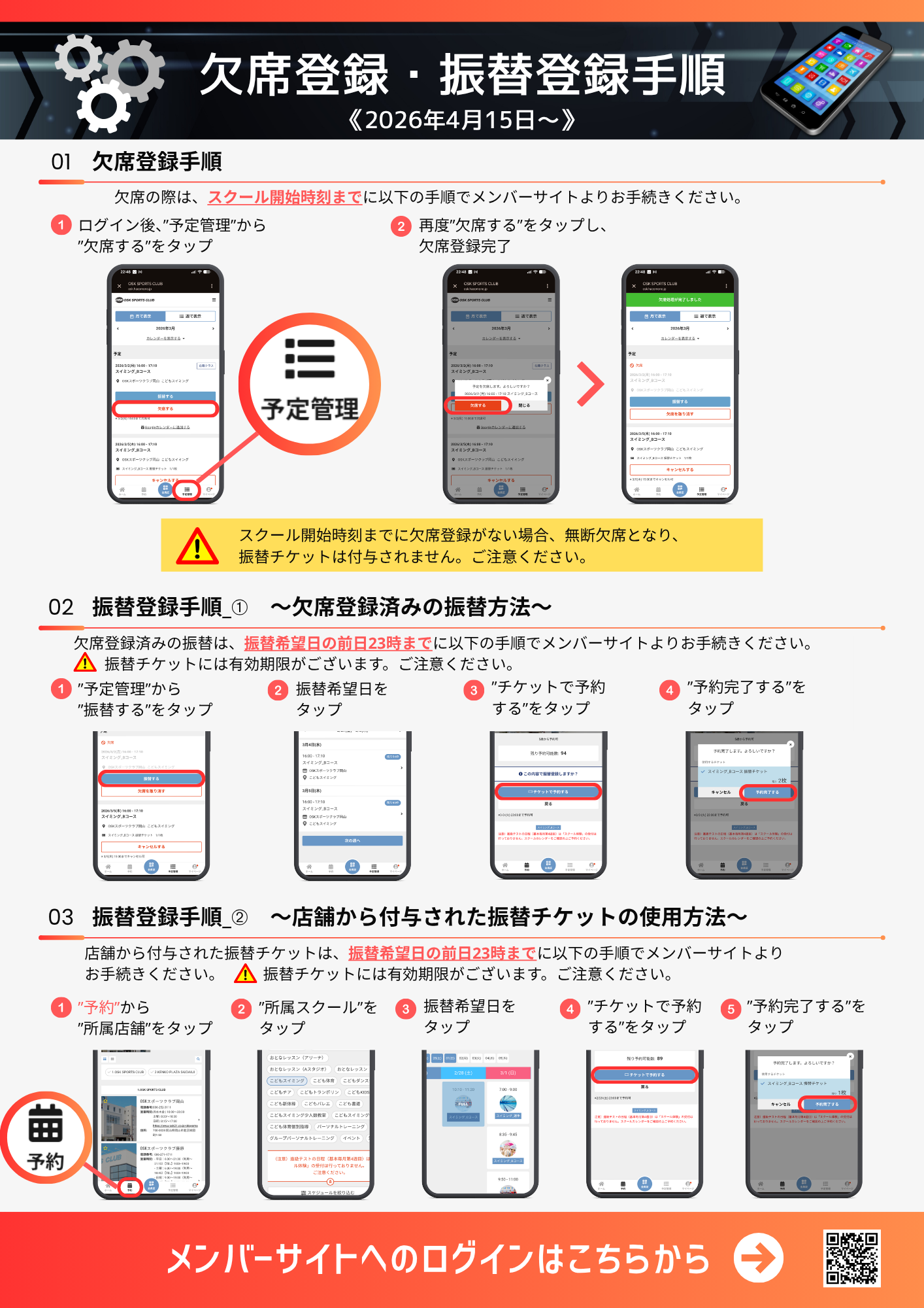以下「欠席登録・振替登録手順」の資料をご確認ください。